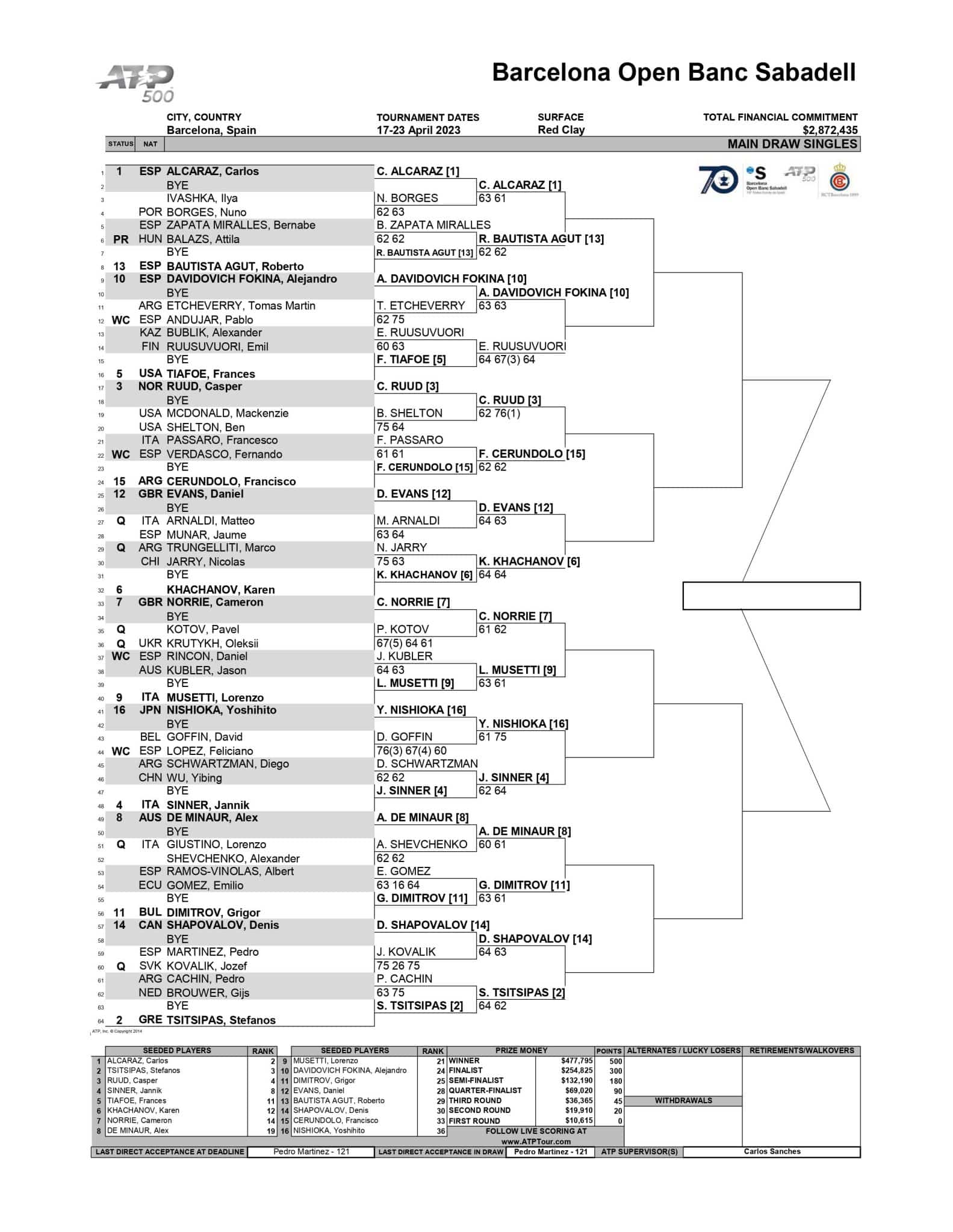 ATP Barcelona 2023 – nagrody pieniężne