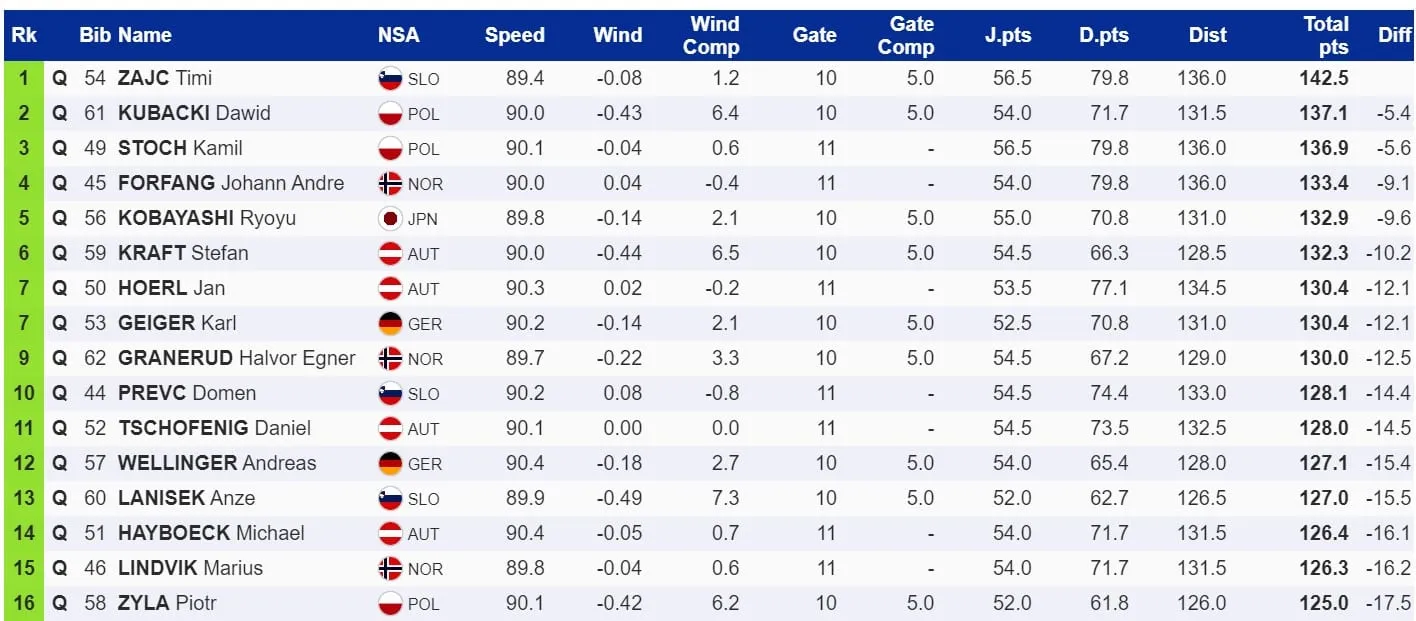 Zwycięzca kwalifikacji, Timi Zajc pofrunął na odległość 136 metów, co było najdłuższym skokiem kwalifikacji. Drugie miejsce ze skokiem na odległość 131,5 metra zajął Dawid Kubacki. Polak miał jedną z największych rekompensat za wiatr. Trzecie miejsce zajął Kamil Stoch, który skoczył 136 metrów, a wiec tyle, co zwycięzca kwalifikacji, Timi Zajc.