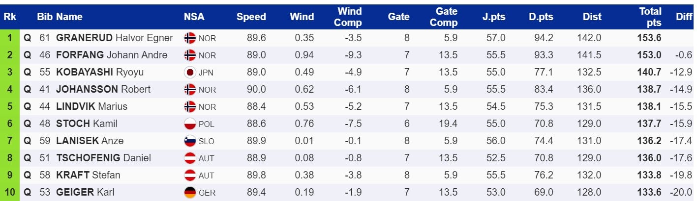 Najbardziej zawiedziony kwalifikacjami może być Andreas Wellinger. Niemiec zajmował siódme miejsce w klasyfikacji generalnej Raw Air 2023, ale oddał tak zły skok, że nie zakwalifikował się do jutrzejszego konkursu. Wellinger wypada więc z gry o klasyfikację generalną norweskiego turnieju.