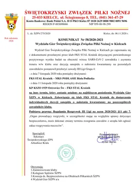 OFICJALNY KOMUNIKAT UMIESZCZONY NA STRONIE ŚWIĘTOKRZYSKIEGO ZWIĄZKU PIŁKI NOŻNEJ