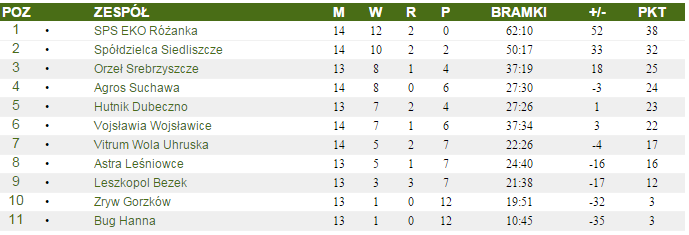 Jeszcze sześć kolejek do końca chełmskiej klasy A, a SPS EKO Różanka wciąż gromadzi punkty z dużą regularnością. Ani jednej porażki w sezonie i bardzo dobra defensywa (0,71 goli traconych na mecz) – to klucz do sukcesu. Punkty mógł odrobić Spółdzielca Siedliszcze, jednak – w zaległym meczu – tylko zremisował z Leszkopolem Bezek.