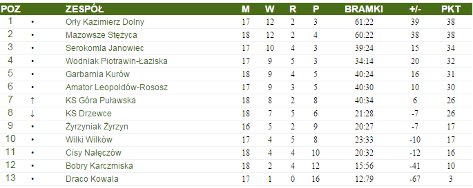 Serokomla Janowiec – po remisie w Wilkowie z tamtejszymi Wilkami – oddala się od pierwszej lokaty na koniec kampanii. Z kolei Draco Kowala – po wygranej przed tygodniem – powalczyło w Kurowie z tamtejszą (świetną na wiosnę) Garbarnią Kurów. Po słabszych występach na dobre tory wraca KS Góra Puławska, który rozbił aż 5:0 Cisy Nałęczów.