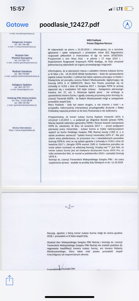 Początkowo Podlasie Biała Podlaska otrzymało informację, że Łukasz Surma dostał tymczasową zgodę na prowadzenie drużyny. W piśmie Małopolskiego Związku Piłki Nożnej możemy przeczytać: “Na wniosek m.in. Soły Oświęcim – Komisja ds. Licencji Trenerskich przy Małopolskim ZPN wydała decyzję o wyrażeniu zgody na czasowe prowadzenie zespołu Soły Oświęcim Łukaszowi Surmie (pismo z 12.10.2018 r.). Decyzje podpisali Ryszard Niemiec (prezes Małopolskiego ZPN) i Zdzisław Kapka (wiceprezes Małopolskiego ZPN, a zarazem przewodniczący Komisji ds. Licencji Trenerskich MZPN).”