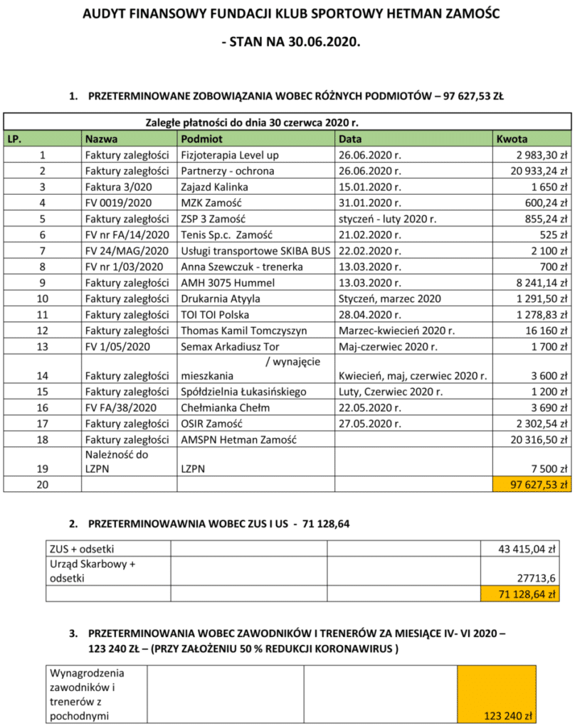- Aktualna kwota wykorzystanej dotacji na dzień 30 czerwca 2020 roku wyniosła 400 tysięcy złotych (80% całej dotacji na cały 2020 rok!). Zatem na drugie półrocze klub pozostał z finansami rzędu 110 tysięcy złotych (100 tysięcy złotych ostatnia transza dotacji oraz 10 tysięcy złotych od sponsora wynikające z umowy sponsorskiej obowiązującej do lipca 2020 roku), gdzie zobowiązania przeterminowane do czerwca 2020 roku wynoszą ok. 330 tysięcy złotych. Zatem realnie na dzień dzisiejszy brakuje w kasie klubu ok. 200 tysięcy złotych, aby zapłacić podjęte przeterminowane zobowiązania i klub nie posiada żadnych pewnych środków na drugie półrocze, które po redukcji są szacowane na kwotę ok. 500 tysięcy złotych.