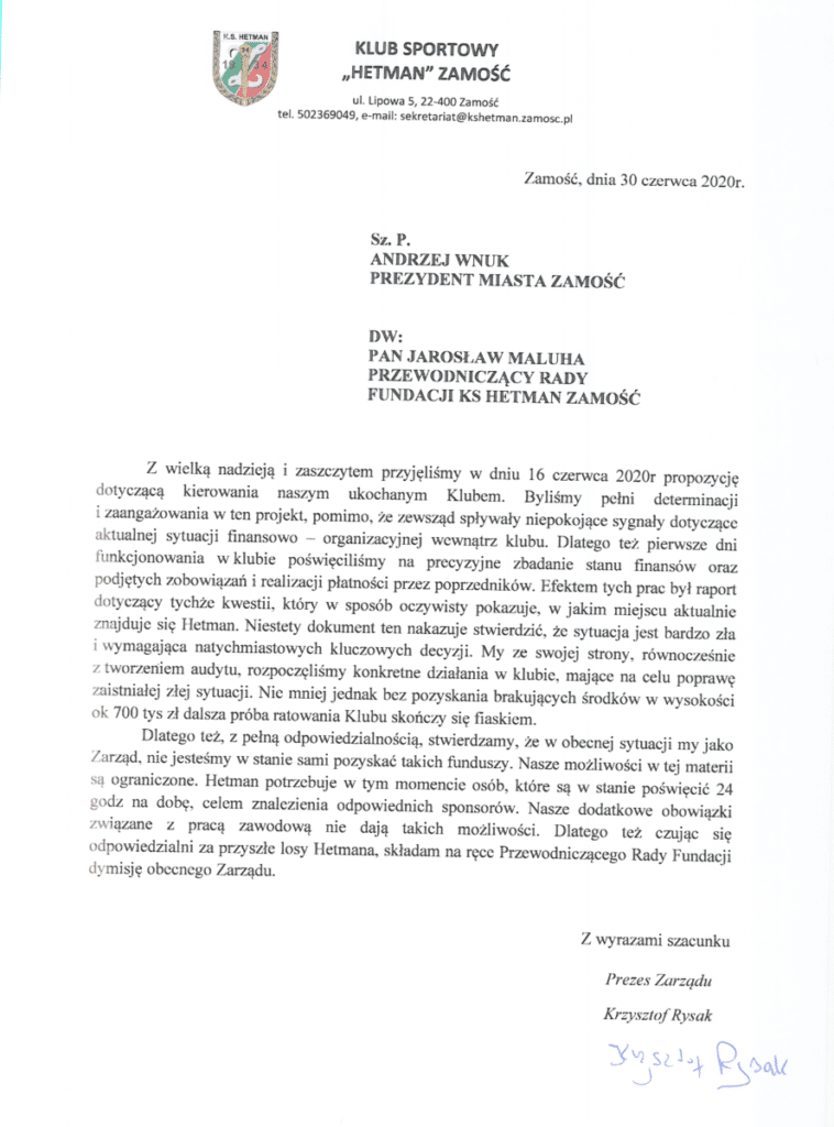 W ostatnim czasie poznaliśmy nazwisko nowego prezesa Hetmana Zamość, którym został Krzysztof Rysak. Nowy zarząd zamojskiego klubu przeprowadził audyt, który ujawnił szereg organizacyjnych nieprawidłowości dotyczących funkcjonowania drużyny. Według wyliczeń deficyt budżetowy wynosi ok. 700 tysięcy złotych. W obecnej sytuacji sternicy Hetmana na czele z prezesem Rysakiem złożyli dymisję na ręce Przewodniczącego Rady Fundacji KS Hetman Zamość Jarosława Maluby.