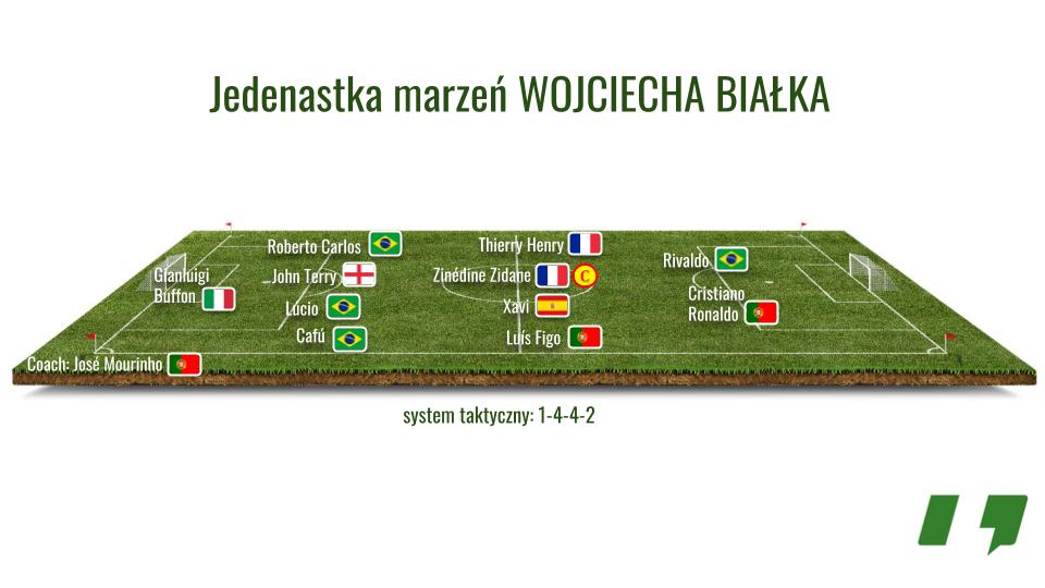 W pierwszym odcinku swój wymarzony skład podał nam snajper Avii Świdnik – Wojciech Białek. Gracz żółto-niebieskich postawił na klasyczny system 1-4-4-2, a kapitanem swojego teamu uczynił legendę Realu Madryt i reprezentacji Francji – Zinedine’a Zidane’a. Z kolei na ławce trenerskiej popularny Biały widziałby Portugalczyka Jose Mourinho. Poniżej prezentujemy całą jedenastkę WB i krótką argumentację każdego wyboru.