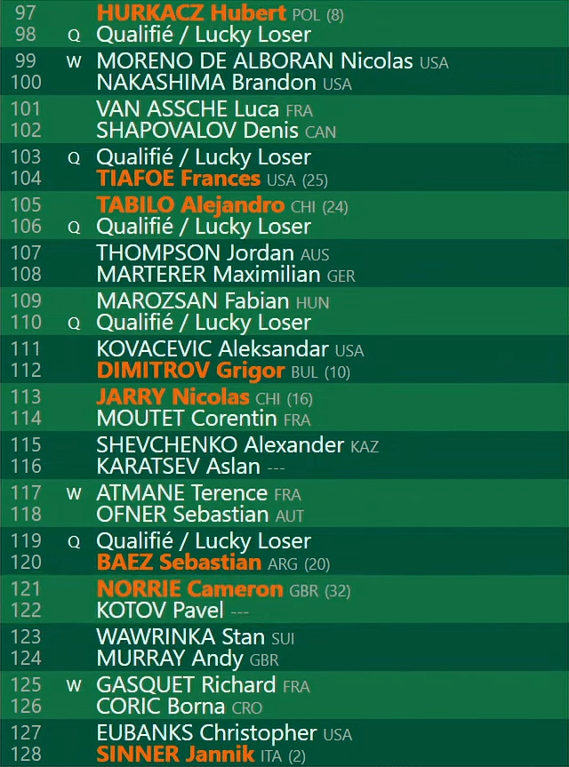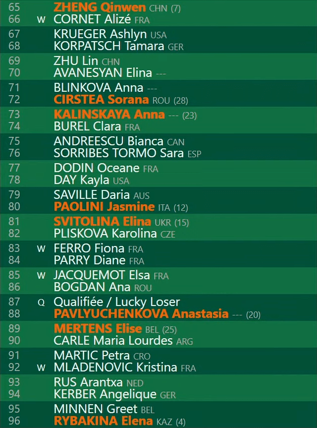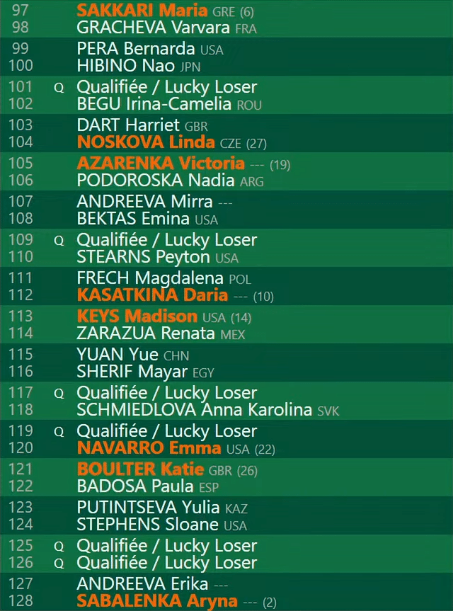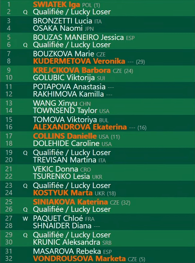 - F: Sabalenka/Rybakina/Zheng/Sakkari/Paolini/Keys/Kasatkina/Azarenka/Navarro/Cirstea/Kalinskaya/Svitolina/Pavlyuchenkova/Noskova/Andreeva