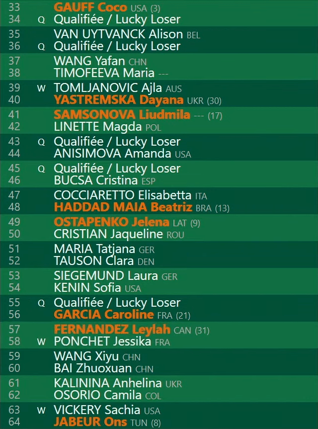 - SF: Gauff/Jabeur/Ostapenko/Haddad Maia/Samsonova/Yastremska/Garcia/Fernandez