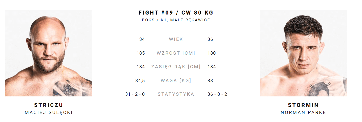 - Maciej „Striczu” Sulęcki vs. Norman „Stormin” Parke – boks/K1, małe rękawice