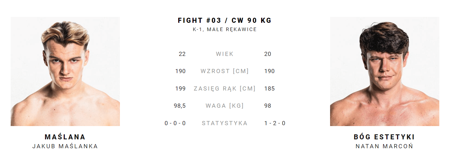 - Natan „Bóg Estetyki” Marcoń vs. Adrian „Polak” Polański – K1/MMA, małe rękawice