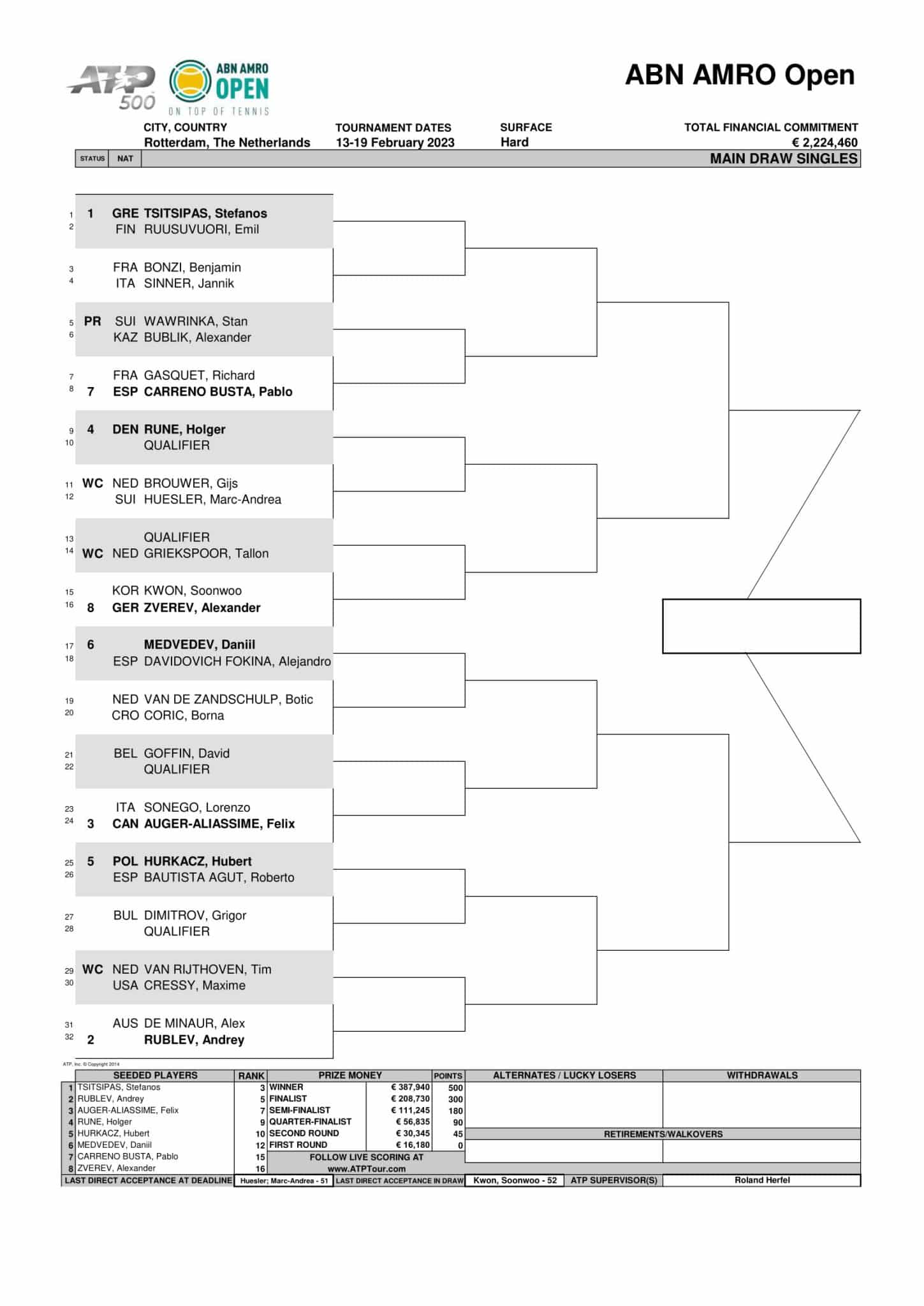 Kwalifikacje ATP Rotterdam 2023 (ABN Amro Open) rozpoczną się 11 lutego 2023 roku, a drabinka główna ruszy 13 lutego 2023. Turniej zakończy się finałem gry pojedynczej mężczyzn, który został zaplanowany na 19 lutego 2023. Jak zatem widać, czeka nas tydzień, miejmy nadzieję, że pasjonującej rywalizacji. Emocji w Rotterdamie nie powinno zabraknąć. Nie tylko ze względu na udział Huberta Hurkacza, ale też wielu tenisistów z czołowej dziesiątki światowego rankingu. Zobacz poniżej jak wygląda na ATP Rotterdam 2023 terminarz.