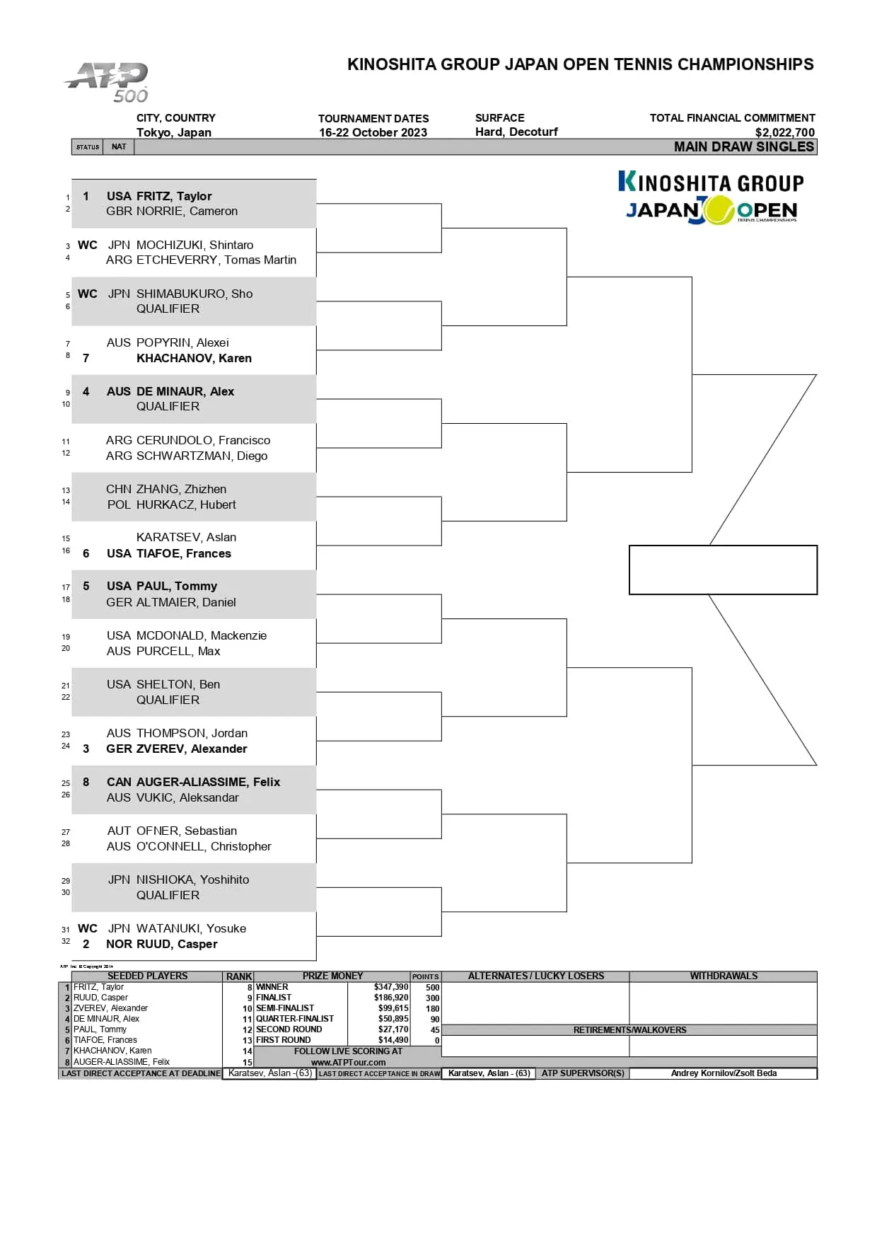Tradycyjnie przed rozpoczęciem turnieju głównego poznaliśmy jego drabinkę. Na liście startowej nie brakuje ciekawych nazwisk. Poniżej można zobaczyć jak prezentuje się ATP Tokio 2023 drabinka i przekonać się, z którymi przeciwnikami mogą zmierzyć się główni kandydaci do zdobycia trofeum w Tokio. Kliknij na zdjęcie, żeby powiększyć drabinkę.