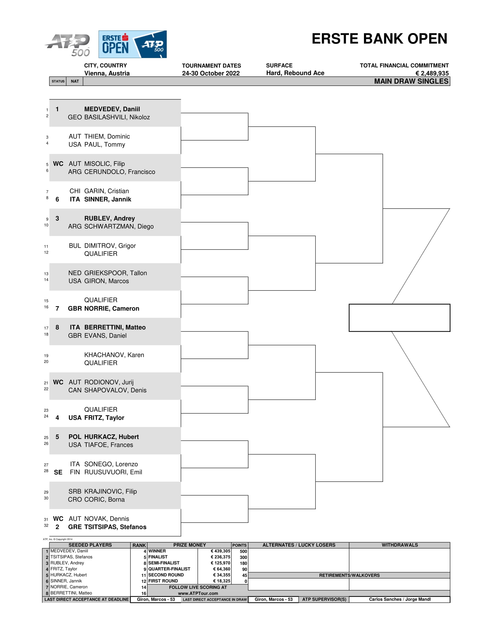 Tegoroczna ATP Wiedeń pula nagród robi wrażenie. Wynosi bowiem 2 349 180 euro, co w porównaniu z nieco ponad 1,5 mln euro rok wcześniej jest sporym skokiem. Zwycięzca ATP Wiedeń 2022 otrzyma 439 305 euro i 500 punktów rankingowych. Także pozostałe ATP Wiedeń 2022 nagrody wyglądają okazale. Spójrz na kompletną listę.