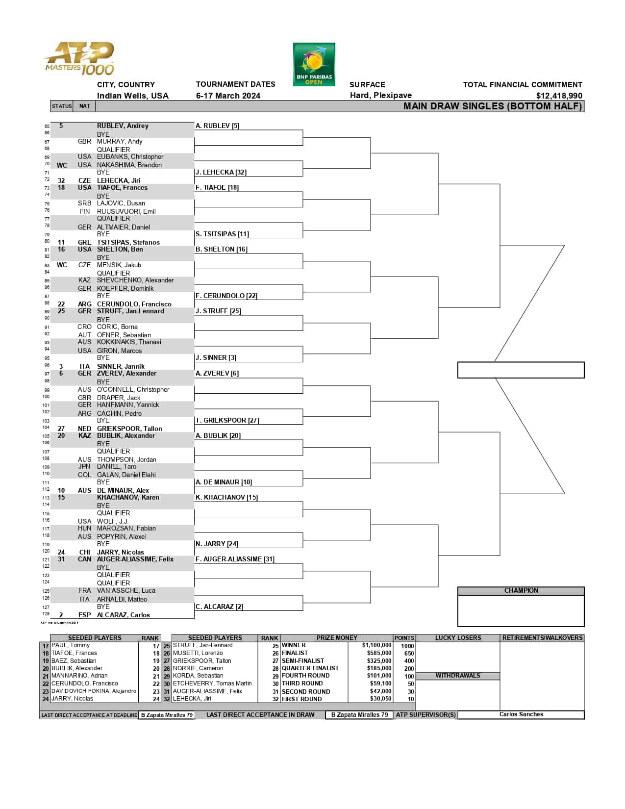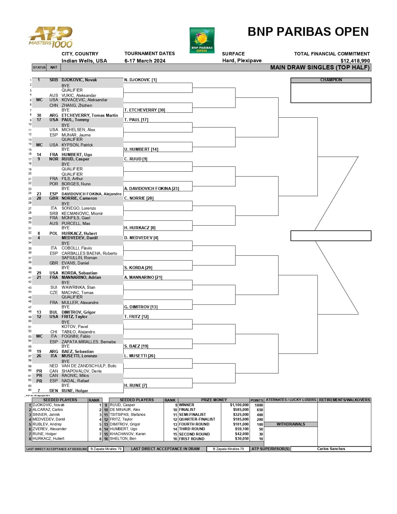 Indian Wells 2024 drabinka gry pojedynczej mężczyzn