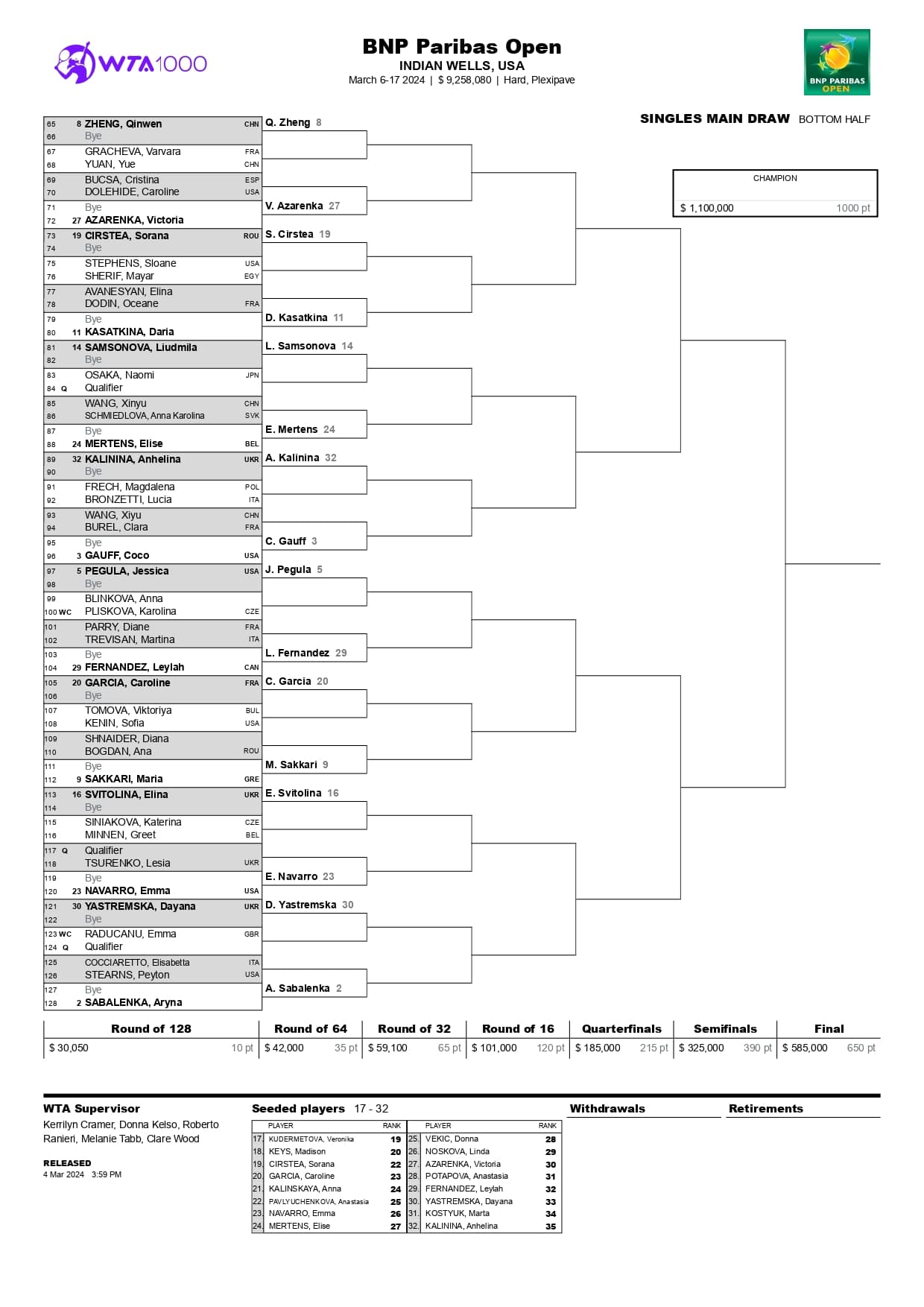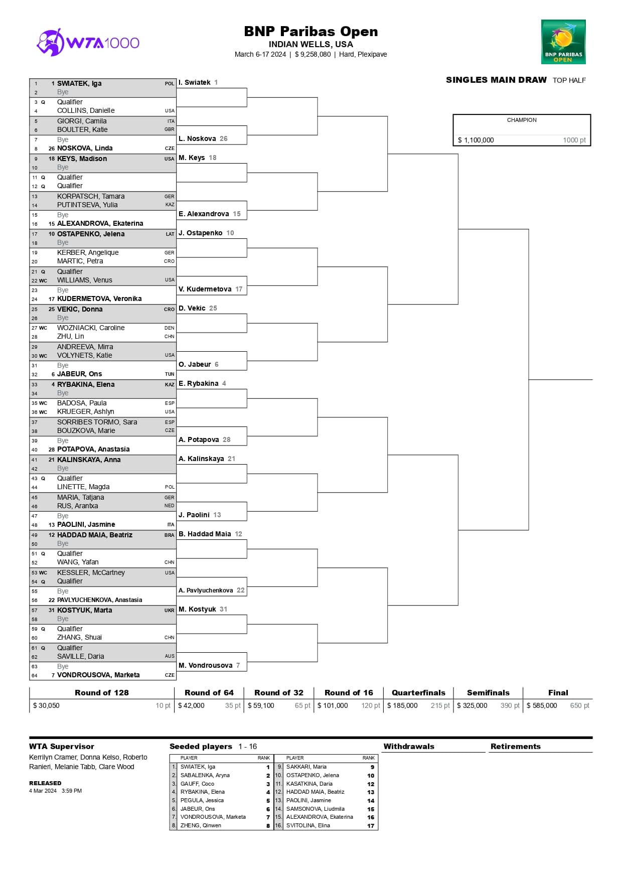 Indian Wells 2024 drabinka gry pojedynczej kobiet