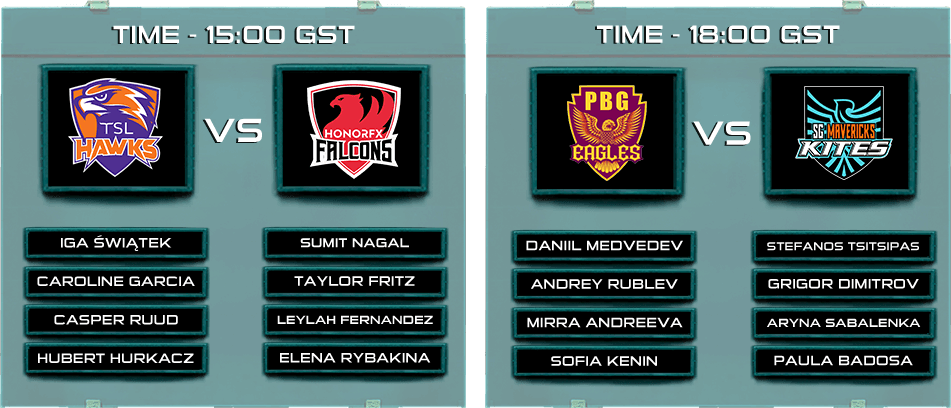 Wspomniano już, że w turnieju World Tennis League 2023 wezmą udział cztery drużyny. Podobnie, jak w zeszłym roku zostały one nazwane jako: Eagles, Falcons, Hawks oraz Kites. W jednej z drużyn, a konkretnie w Hawks znalazła się Iga Świątek i Hubert Hurkacz.