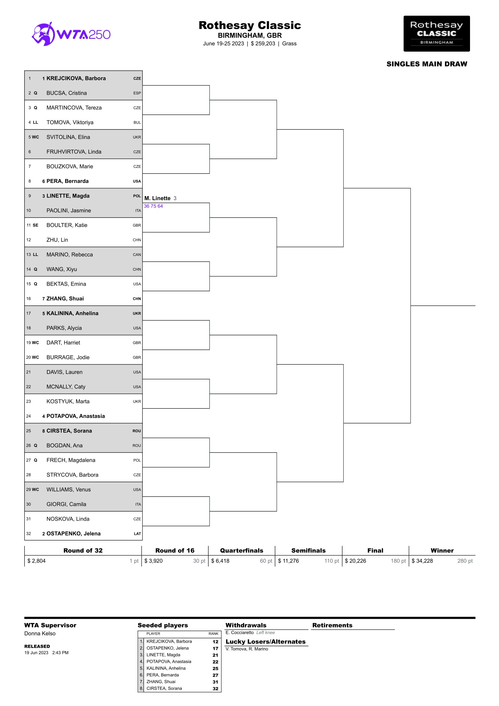 WTA Birmingham drabinka pokazuje możliwą drogę najlepszych tenisistek do zaplanowanego na niedzielę finału. Rozstawiona z numerem pierwszym została Barbora Krejcikova, a z numerem drugim Jelena Ostepenko. Na liście startowej imprezy w Birmingham są między innymi Anastasija Potapowa, Anhelina Kalinina czy Sorana Cirstea. Dzika karta została przyznana Venus Williams, której występ jest dużym wydarzeniem nie tylko dla publiczności w Wielkiej Brytanii.