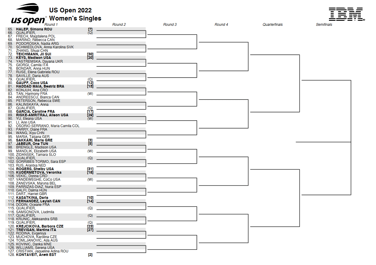 WTA US Open 2022 drabinka gry pojedynczej kobiet