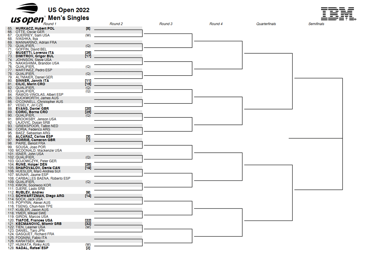 ATP US Open 2022 drabinka gry pojedynczej mężczyzn