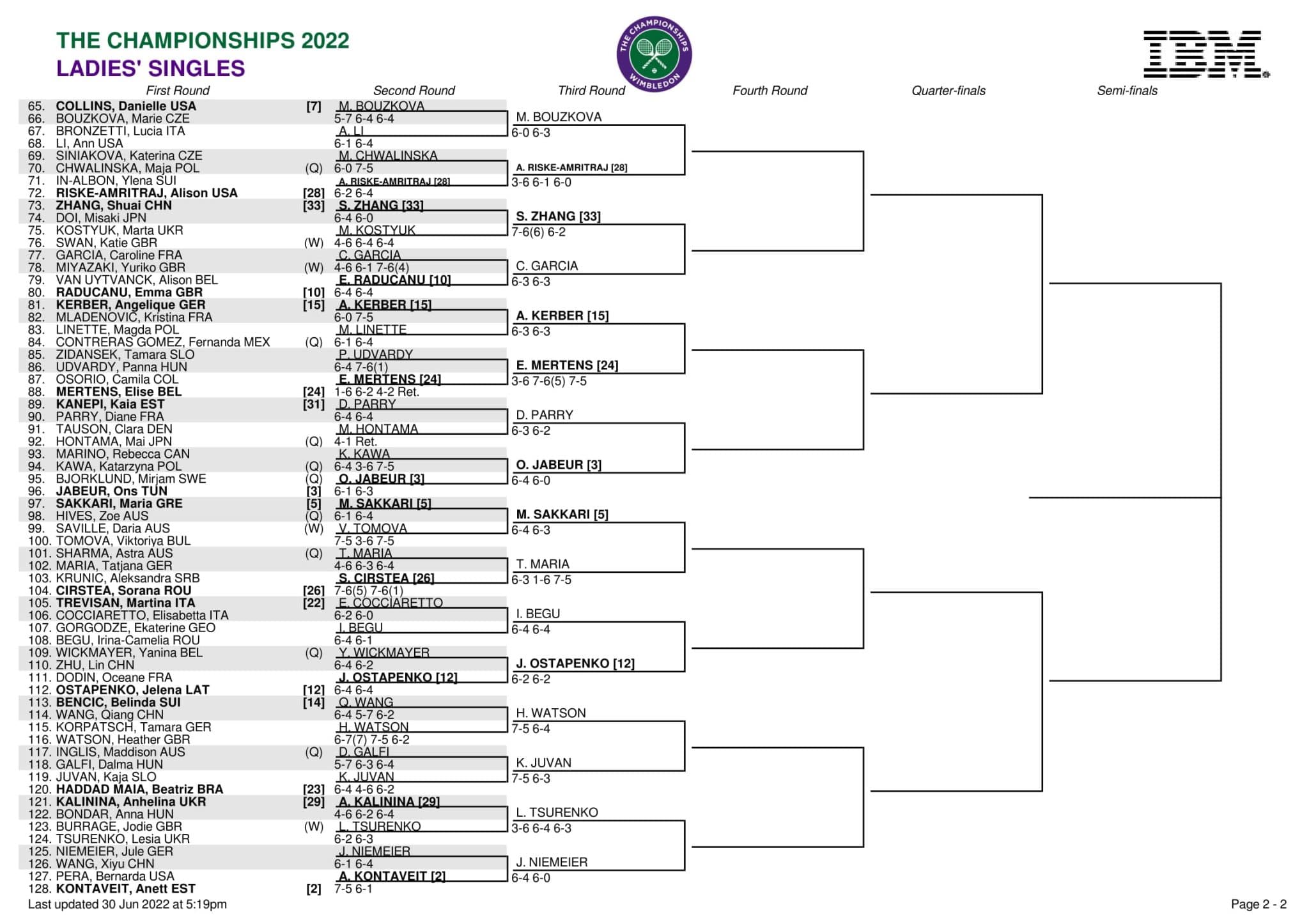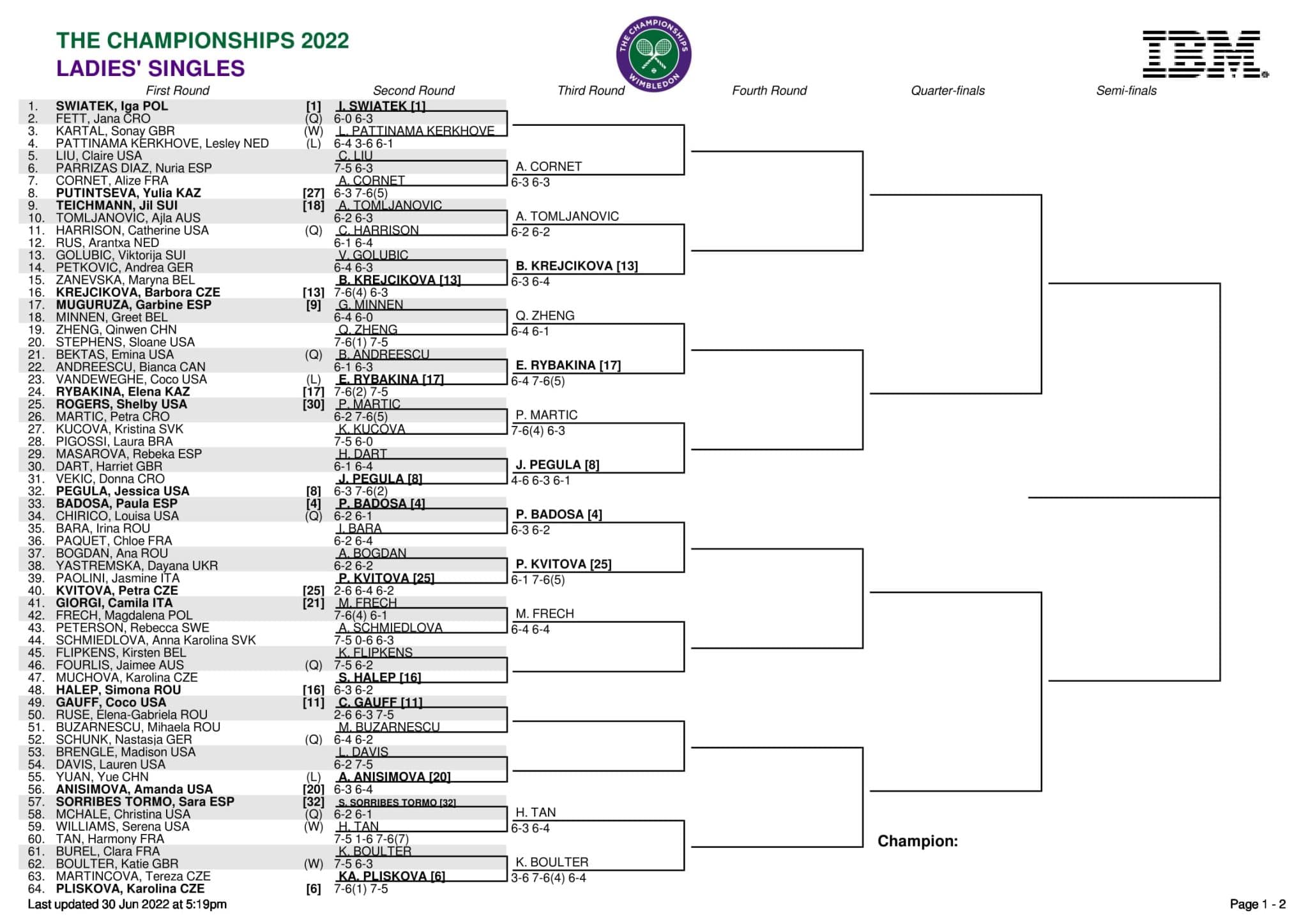 WTA Wimbledon drabinka gry pojedynczej kobiet