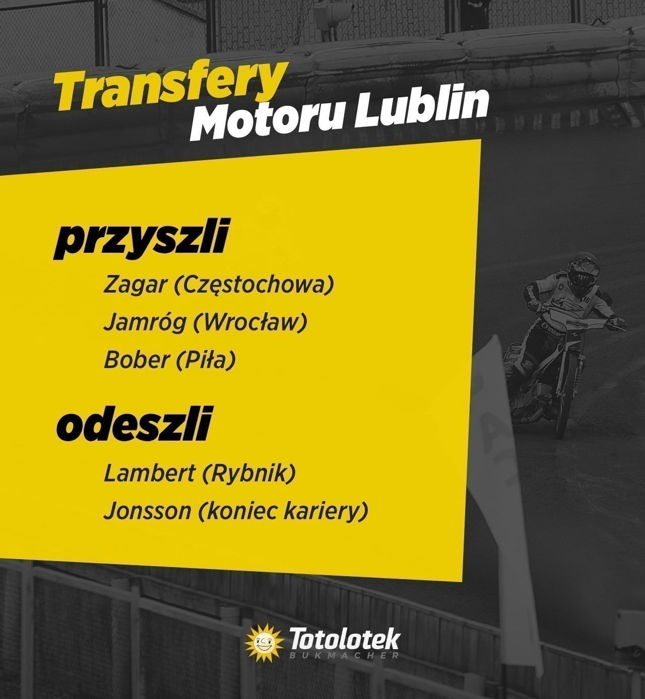 Można rzec, że Robert Lambert oraz Andreas Jonsson zostali zastąpieni przez Mateja Zagara oraz Jakuba Jamróga. Jak ocenimy tę wymianę? Według mnie jak najbardziej na plus. Oczywiście sezon wszystko zweryfikuje, ale opierając się na obecnej wiedzy wydaje się, że okres transferowy Motoru Lublin powinien przynieść korzyści.